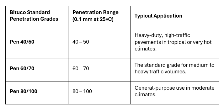 Penetration Grade Bitumen is the standard binding material used primarily in the paving of asphalt concrete. Its classification is based on its consistency, which is measured by the depth in tenths of a millimeter, or 0.1mm that a standard loaded needle penetrates a bitumen sample under controlled conditions 25∘C. It is the classic, cost-effective choice for constructing durable and long-lasting road surfaces under moderate climatic and traffic conditions.